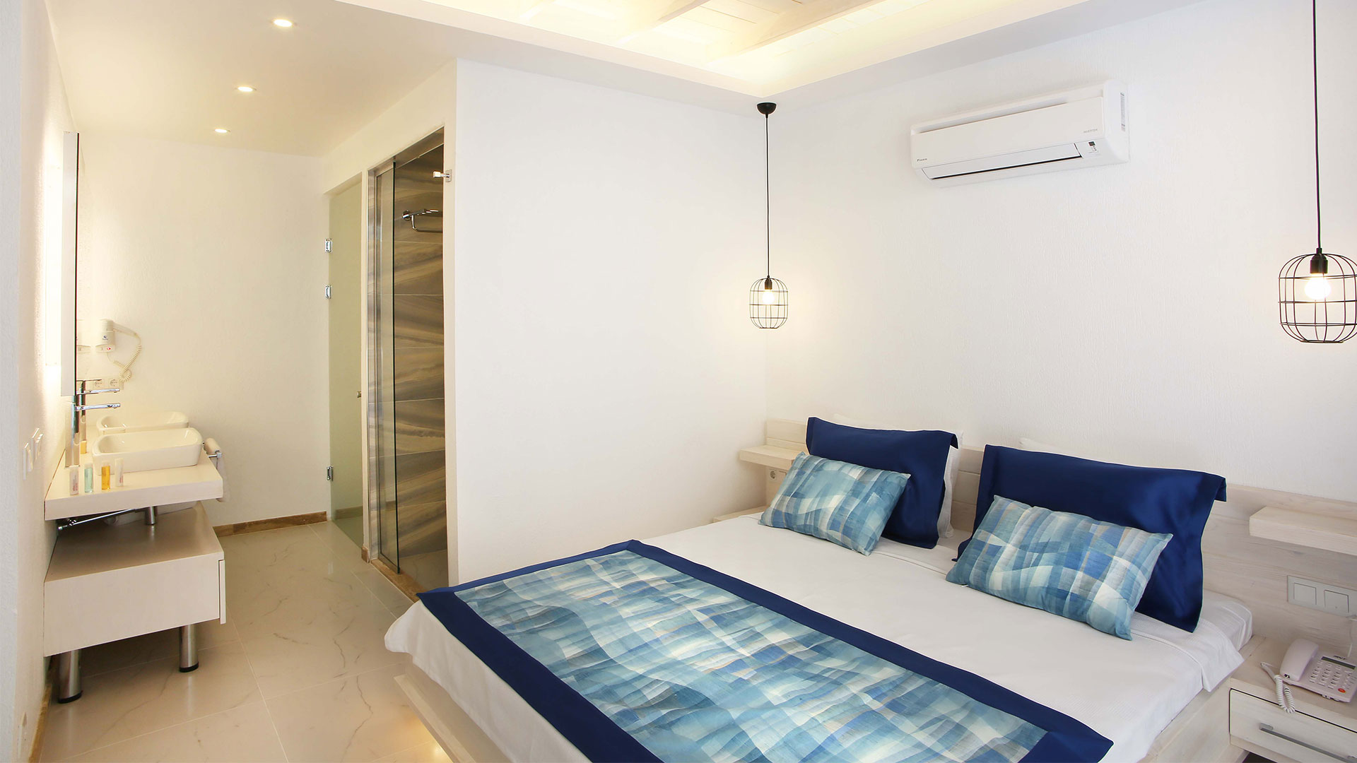 Akdeniz mimarisine sahip mavi ve beyazın hakim olduğu odalarımızın bahçesinde bulunan havuz veya jakuzide keyifli bir tatil yapacaksınız...