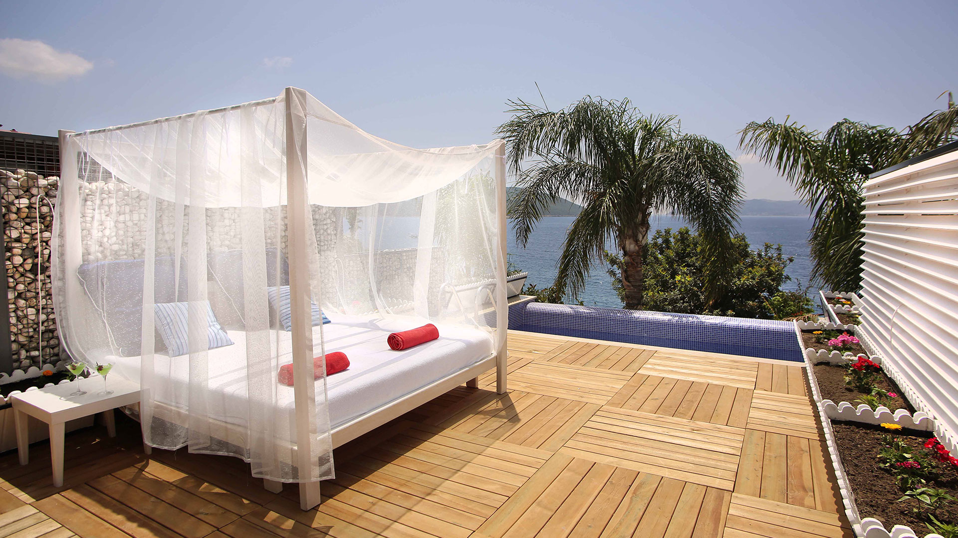 90 m2 büyüklükte yaşam alanı, kendine ait terasında sonsuzluk havuzu, cibinlikli kabanası ve salıncağı vardır. Akdeniz mimarisine sahip mavi ve beyazın hakim olduğu odalar huzurun sembolü... Eşsiz Akdeniz ve Meis Adası manzarasına sahip...