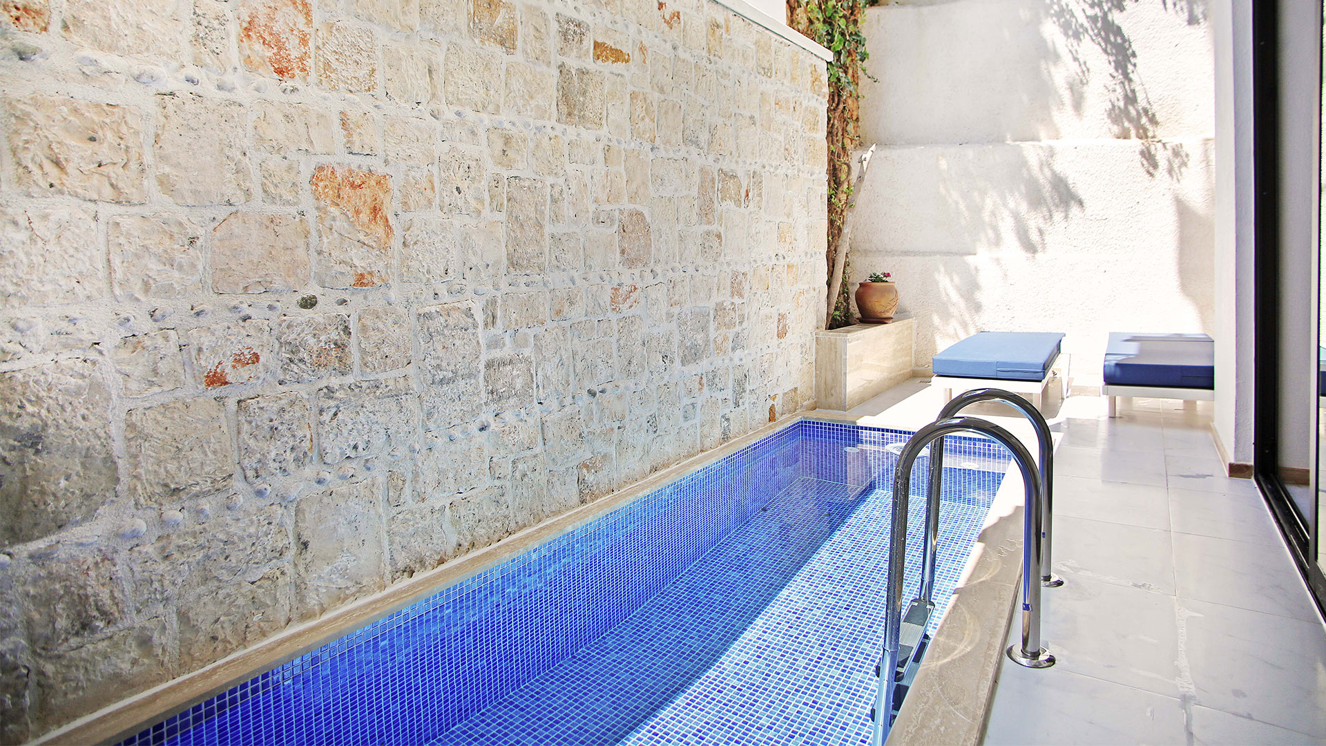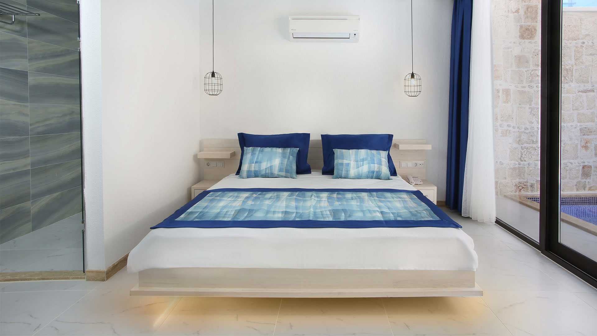 Akdeniz mimarisine sahip mavi ve beyazın hakim olduğu odalarımızın bahçesinde bulunan havuz veya jakuzide keyifli bir tatil yapacaksınız...