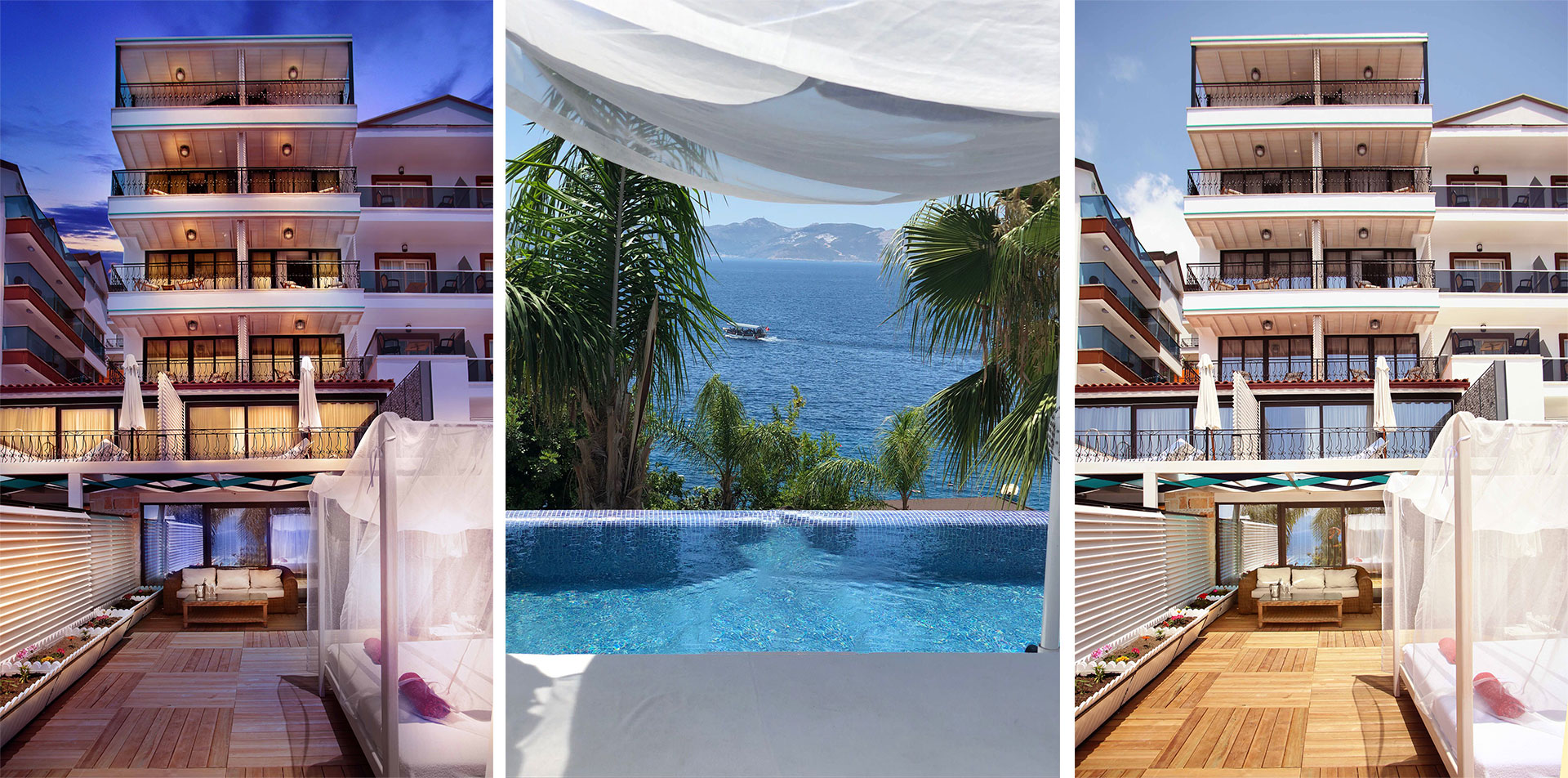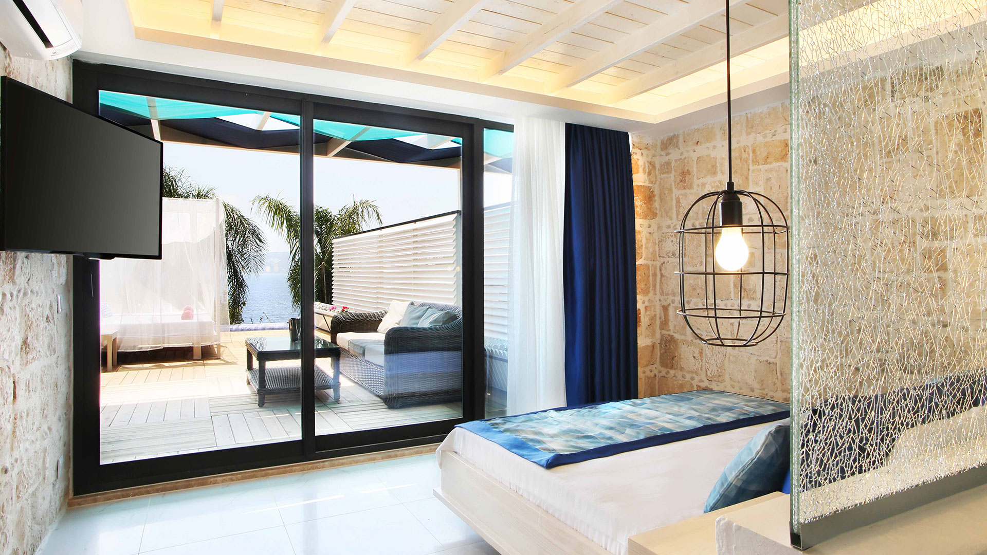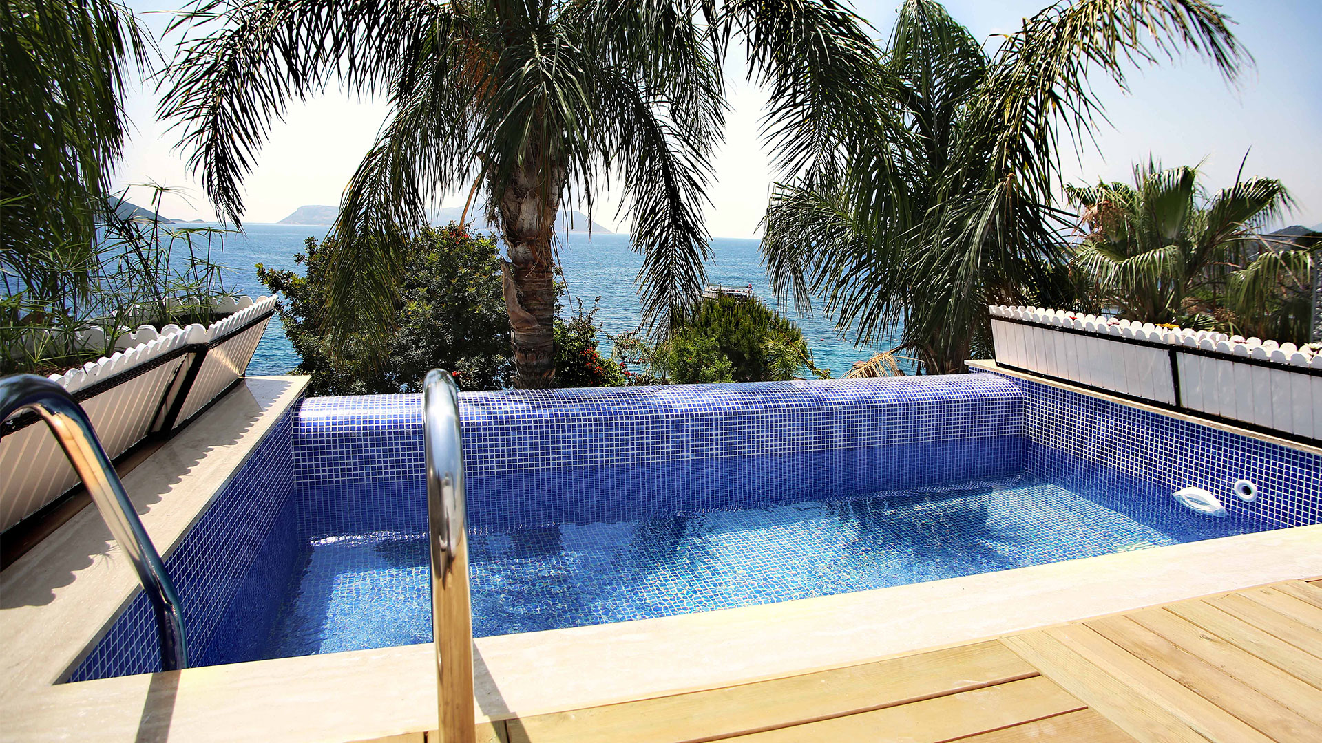 90 m2 büyüklükte yaşam alanı, kendine ait terasında sonsuzluk havuzu, cibinlikli kabanası ve salıncağı vardır. Akdeniz mimarisine sahip mavi ve beyazın hakim olduğu odalar huzurun sembolü... Eşsiz Akdeniz ve Meis Adası manzarasına sahip...